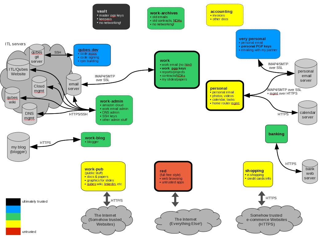Let's discuss this diagram bit by bit. The three basic domains are work (the green label), personal (the yellow label), and red (for doing all the untrusted, insensitive things) – these are marked on the diagram with bold frames.