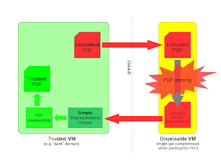 An interesting question is, however, can we come up with another form of Simple Representation that would allow e.g. to preserve the text searching ability of the converted PDFs (and DOCs, PPTs)? Probably... yes. The choice of the Simple Representation should be thought of as of a trade-off between security and document's features preservation. I'm not an expert on PDF and DOC formats (and I'm not sure I want to be) but it seems plausible that one could disassemble PDF into simple pieces, select the really simple ones, send those pieces as a Simple Representation back to client, and have them reassembled back into a almost-fully-functional PDF. Here, again, the point is that the PDF parsing is done in isolated Disposable VM, while the reassembly in the trusted VM. Anyway, let me leave it as a exercise for the reader :)